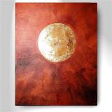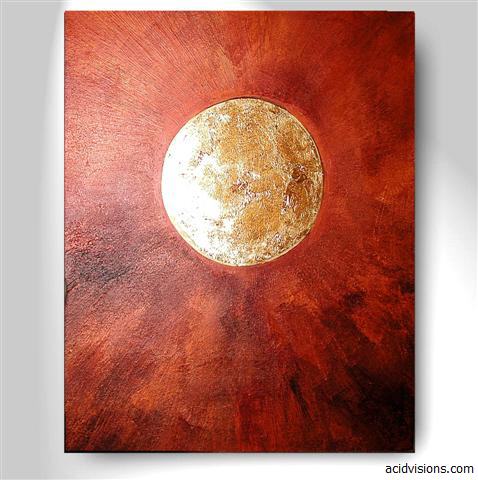 Dieses Gemälde wurde mit einer Auflage aus Kompositionsgold ausgestaltet. Leider läßt sich Gold sehr schwer fotografieren. Es schimmert je nach Lichteinfall unterschiedlich und wirkt auch im Halbdunkel sehr ansprechend und geheimnisvoll. Die außergewöhnliche Farbkomposition harmoniert hervorragend mit der Metallauflage. Die Seiten des Keilrahmens sind bemalt. Im Original sind die Farben wesentlich schöner und von einer großen Intensität und Leuchtkraft. Abhängig vom Gemäldestandort und der jeweiligen Tageszeit bzw. dem Lichteinfall enthüllt das Bild immer wieder neue Facetten seiner Ausstrahlung und Wirkung. Somit verwandelt es auf stimmungsvolle Weise auch die Atmosphäre des Raumes.